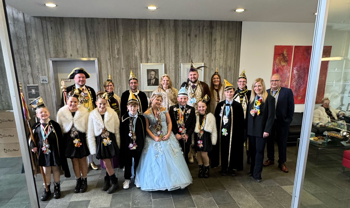 Begrüßt wurden die Hoheiten von Sina Lupp mit dem traditionellen Niddarer Fastnachtsruf „Häi Dou“. Im Anschluss zog die fröhliche Gesellschaft durch das Bürogebäude und verbreitete – entsprechend dem Motto „Bringt Blummeschmuck un Baströck‘ bei, die Näirer mache uff Hawaii!“ – beste Laune und Aloha unter den Mitarbeitenden.